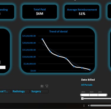 Instead of static spreadsheets, users see live dashboards that display the entire financial picture at a glance. Outstanding balances, denial categories, reimbursement rates, and payer trends are all presented visually. Leaders can instantly see which areas require attention and how much revenue is at risk.
