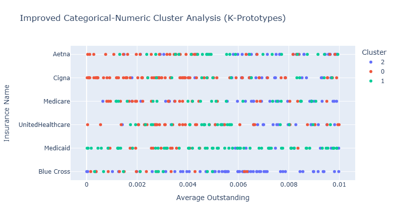 Using K-prototypes clustering, claims were grouped based on both numerical and categorical attributes — such as denial rate, payment delay, and payer type.
